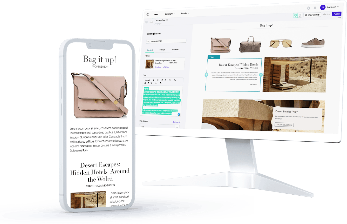 Thanks to the capabilities of its design technology, Styla CMS adapts your content to be running smoothly on every device perfectly styled in realtime. Also, as you can embed Styla CMS throughout your entire website and customer journey, our CMS will work its design