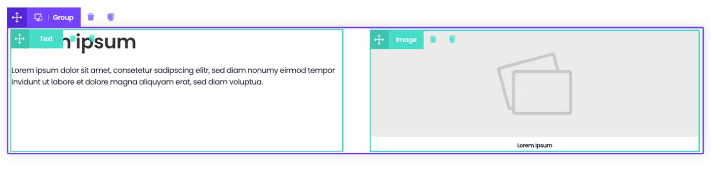In the edit and layout view, Groups are displayed with a purple border; Elements with a turquoise border.