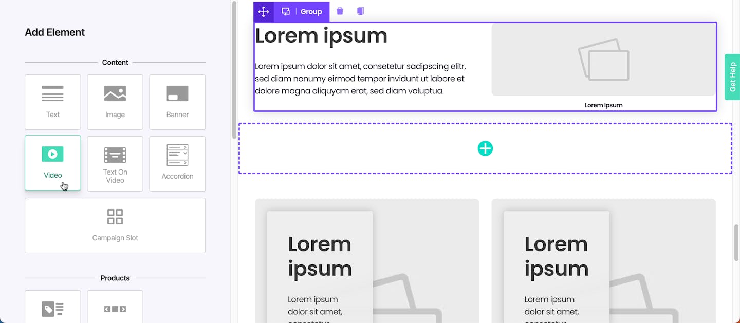 To add a new Element, click on the turquoise "+"-icon and choose one of the Elements on the left side e.g. Text Element, Image Element, Banner Element. The corresponding Element will be inserted at the position (in the example below, a Video Element will be placed in between the existing Groups).
